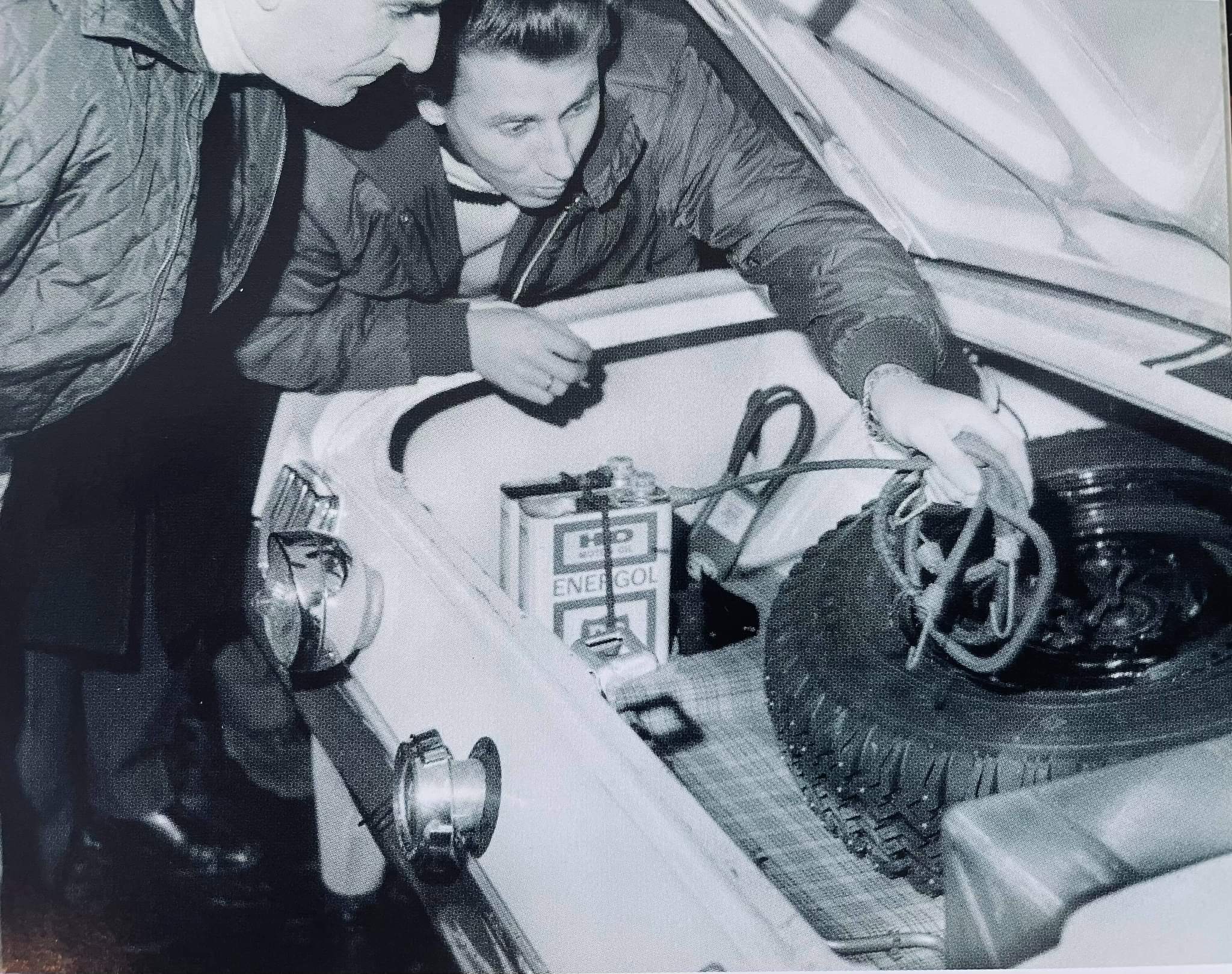 On le voit en compagnie de Geminiani détaillant quelques pièces embarquées dans la malle arrière.